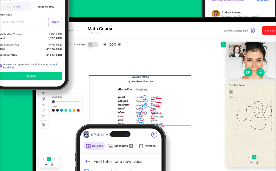 Studia Academy, a Hong Kong-based tutoring platform, connects students with tutors. Parents enroll and monitor progress, while an interactive meeting room with a whiteboard and recordings enhances learning.